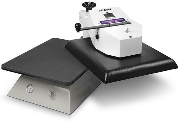 QUICK LOOK: The DK20SP is an air-operated automatic table top swing-away heat transfer press. The DK20SP provides a production oriented heat press with the benefits of push button operation, fully digital temperature & time control, and solid casting design with an affordable automatic heat press price. It is available in a 16" x 20" heater block size.