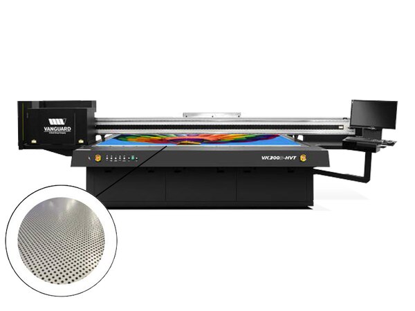 Built on the same award winning VK300D-HS platform with all the robust functionality, the VK300D-HVT is the big brother of table upgrades. Built with a custom milled aluminum tabletop made specifically for corrugated package printing, this flatbed will have your team producing at an incredible pace without the fear of curled substrates and head strikes. The vacuum table is made up of 127,000 1/8th inch holes and two 7.5 horsepower Spencer blower motors for maximum substrate stability while printing.